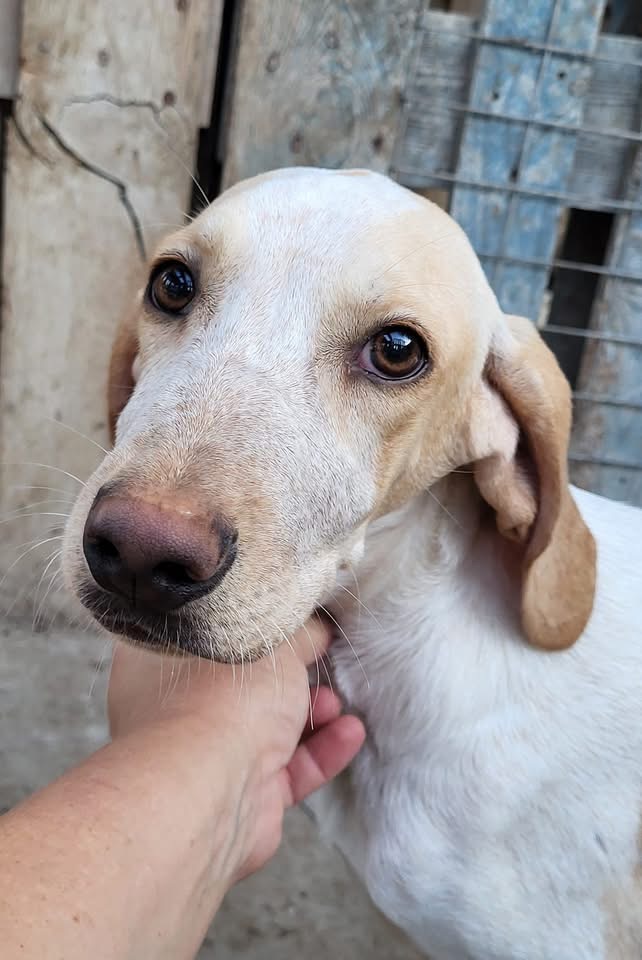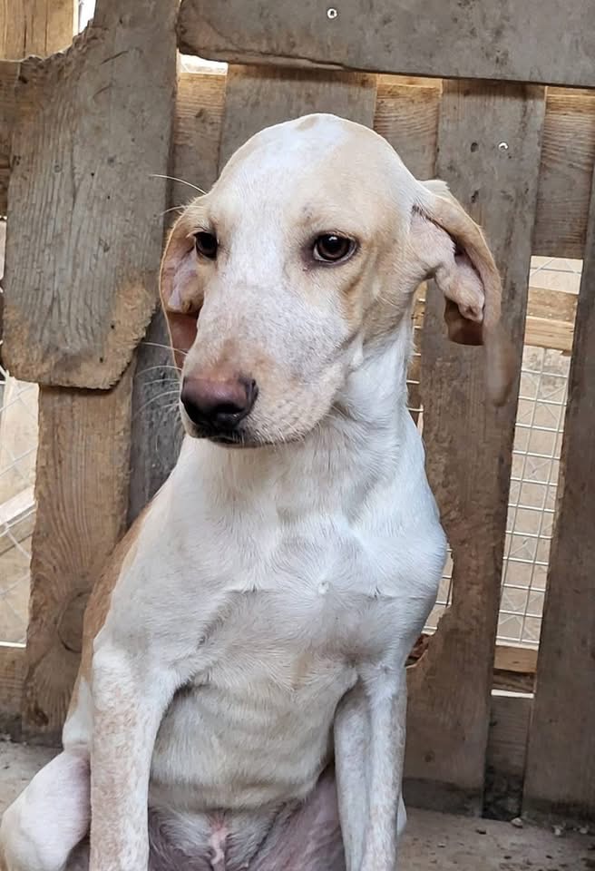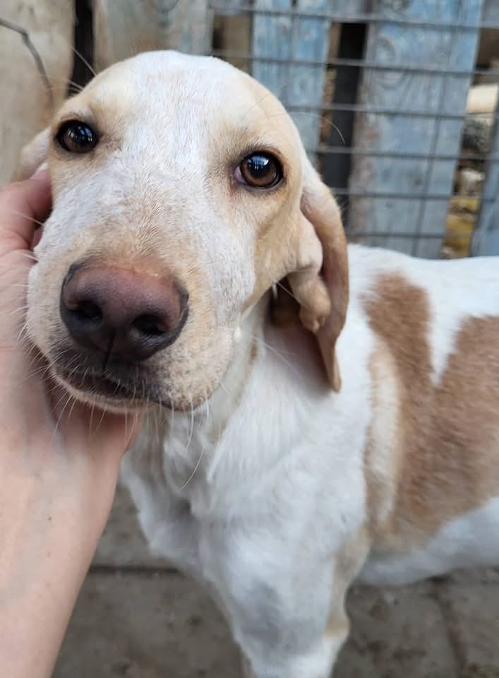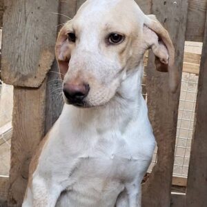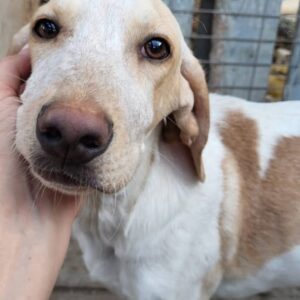 Bertie is a male pointer mix, beige-tan. This gorgeous boy is around 4-5 months old and will be medium to large size when fully grown. From the photos we post now, you can see that Bertie an impressive boy. From his colours, skin and body shape we would easily bet that the pups have bracco in them. Bertie is currently sharing a cage with his brother Charlie.