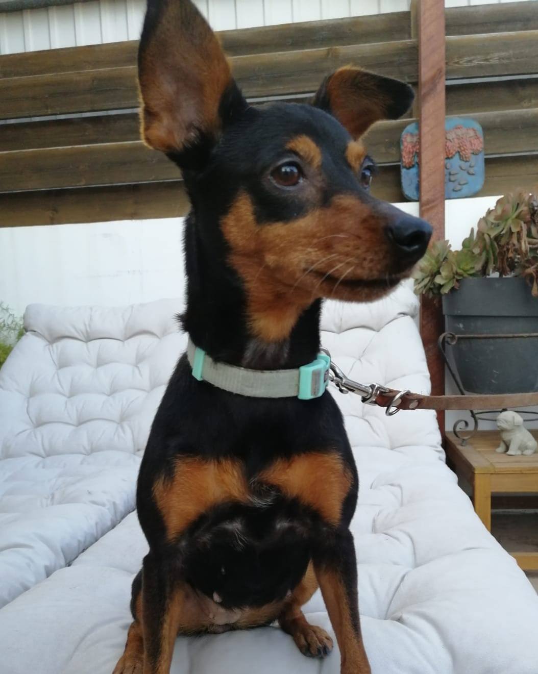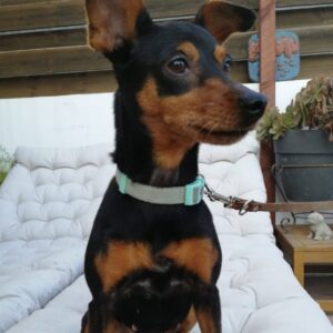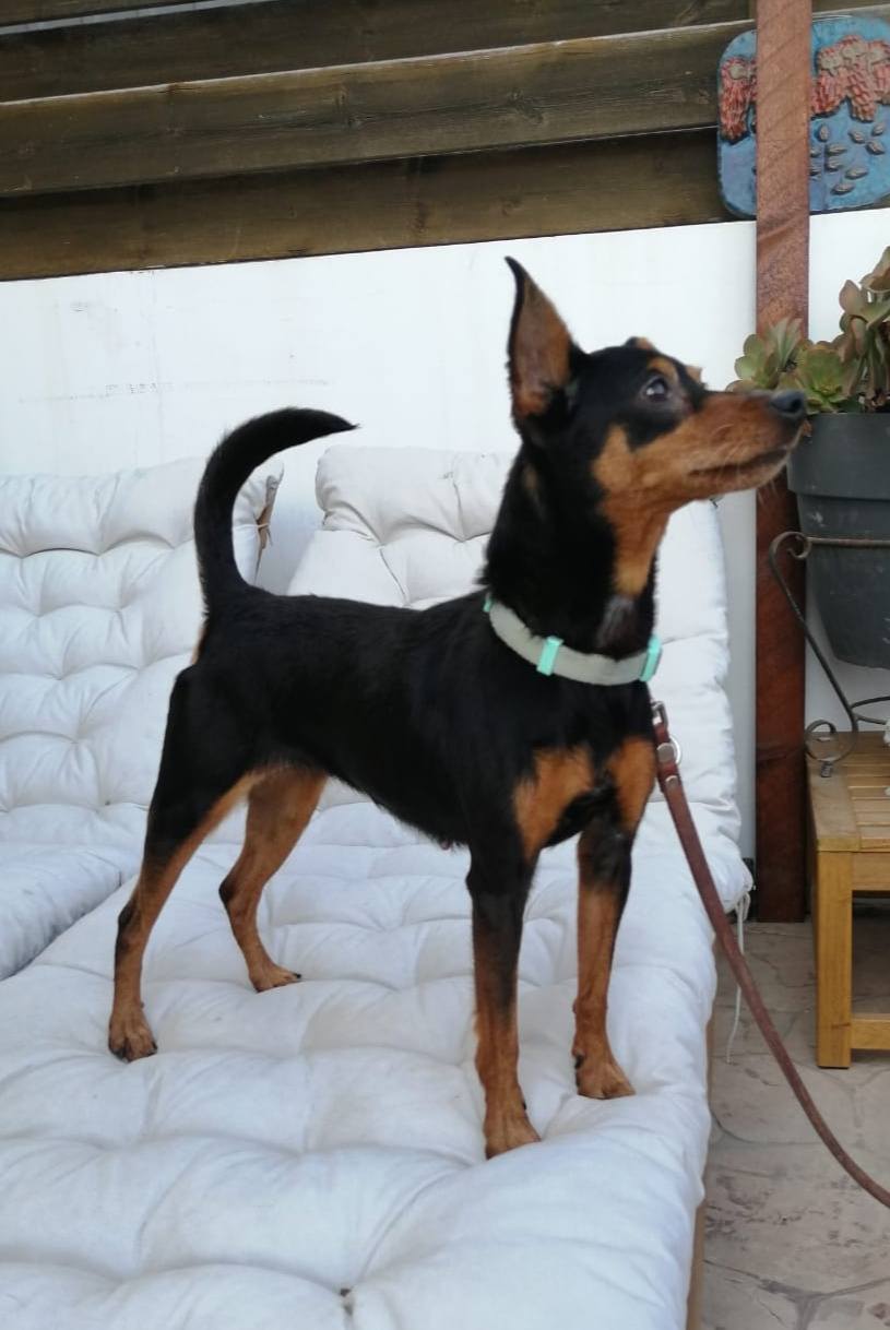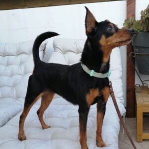 Hayley was an adult when she was found abandoned and we believe shes around 5 years old. Shes a sociable dog with hunans and dogs but not cats. Pinchers and cats arent the best friends. There are exceptions but not many. So far we never saw a cat friendly dog but that doesn’t mean they dont exist. She is though amazing with humans which makes things even. Hayley is lead trained, toilet trained and fine in the house. She really love cuddles and playing with ther humans. If you know the breed already, then you know what she is like.